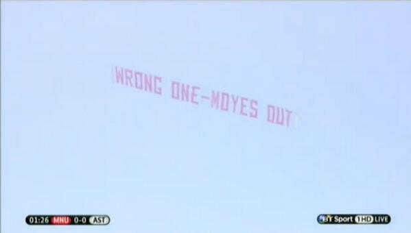 FOTO MANCHESTER UNITED MOYES – Di male in peggio per David Moyes. Non c’è infatti pace per il tecnico del Manchester United, fortemente criticato dai tifosi dei Red Devils a causa di un rendimento stagionale a dir poco pessimo. Quest’oggi, dopo pochi minuti dall’inizio della gara tra lo United e l’Aston Villa, i tifosi hanno deciso di portare avanti un’insolita protesta per manifestare il proprio dissenso contro il manager ex Everton. Uno striscione con un messaggio chiarissimo, attaccato ad un aereo, è stato fatto sorvolare sopra l’Old Trafford. Un modo senza dubbio originale per protestare contro lo scozzese tecnico del Manchester.