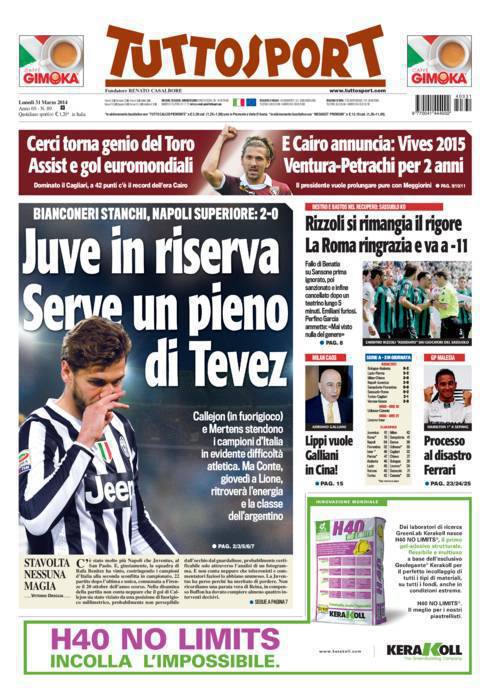 TUTTOSPORT JUVENTUS TEVEZ – Tuttosport parla di una Juventus stanca e soprattutto poco pungente senza Tevez.