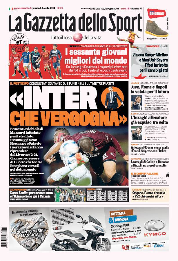 GAZZETTA INTER – L’Inter pareggia contro il Livorno per due a due, Mazzarri infuriato con i suoi.