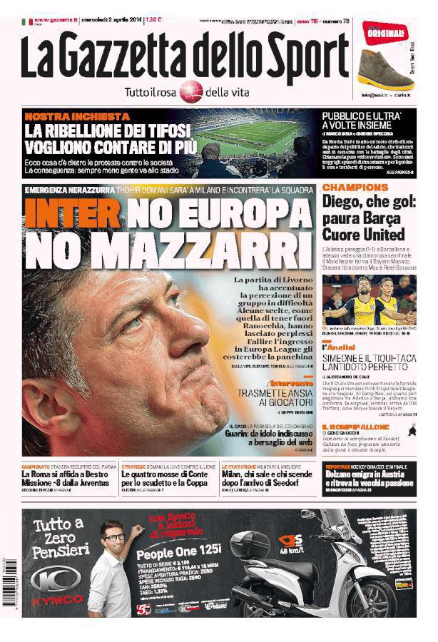 GAZZETTA INTER – La Gazzetta dello Sport rivela che l’Inter senza Europa potrebbe mandare via Mazzarri.
