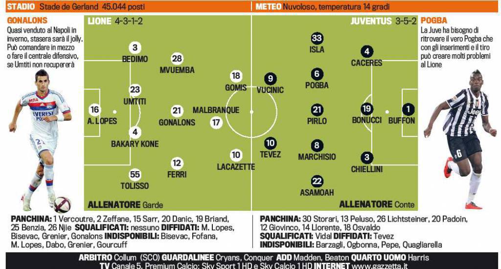 FOTO LIONE JUVENTUS VUCINIC TEVEZ LACAZETTE – Questa sera in Francia la Juventus cercherà di fare risultato nell’andata dei quarti di finale di Europa League. Antonio Conte è stato molto chiaro, vuole la Coppa anche perché la finale sarà a Torino. I bianconeri pronti a scendere in campo con il solito modulo con Tevez in attacco accanto a Vucinic, preferito a Llorente. A destra ci sarà Isla che sta rispondendo bene alla fiducia di Conte. Nel Lione occhio a Lacazette, attaccante francese che piace molto alla Juventus. Le probabili formazioni secondo la Gazzetta dello Sport.