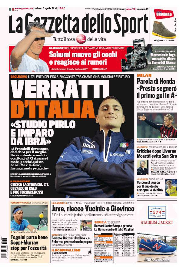 Gazzetta dello Sport – Verratti d’Italia ‘Studio Pirlo e imparo da Ibra’ 05/04/2014 di Ruggieri GAZZETTA VERRATTI – La Gazzetta dello Sport ha intervistato in esclusiva Marco Verratti, centrocampista italiano del Psg. la redazione di calciomercatonews.com