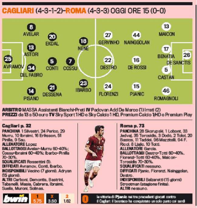CAGLIARI ROMA PROBABILI FORMAZIONI – La Roma, alle 15, scenderà in campo contro il Cagliari. L’obiettivo è tornare a casa con una vittoria per mettere pressione sulla Juventus. Contro i sardi, però, i giallorossi non vincono in trasferta dal 1995. Il Cagliari è a quota 32 punti ma non si considera ancora tranquillo. Lopez schiererà i sardi con il 4-3-2-1 con Avramov in porta; Pisano, Del Fabro, Astori e Avelar in difesa. Dessena, Conti, Ekdal a centrocampo. Cossu alle spalle di Ibarbo e Nenè. Garcia risponde con il 4-3-3 con De Sanctis tra i pali; Romagnoli, Castan, Benatia e Maicon in difesa. Nainggolan, De Rossi e Pjanic in difesa. Gervinho, Destro e Florenzi in attacco.