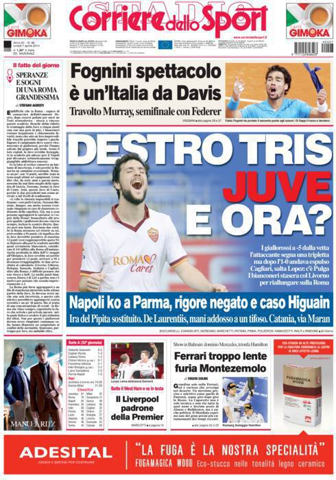 CORRIERE DESTRO – Il Corriere dello Sport parla della Roma che vola a meno cinque dalla Juventus che questa sera sarà impegnata contro il Livorno.