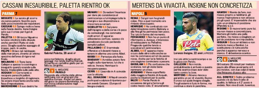 FOTO PARMA NAPOLI VOTI PAGELLE GAZZETTA PAROLO HIGUAIN – Il Parma vince uno a zero contro il Napoli grazie al gol di Marco Parolo, centrocampista e migliore in campo del match. Suo il gol decisivo su assist di Cassani che ha fatto un match importante. Il Parma si muove bene, Paletta è insuperabile in difesa. Il Napoli invece appare stanco, Higuain è molto nervoso e contesta Benitez durante il cambio con Zapata. E fuori dallo stadio litigio tra De Laurentiis e un tifoso. Voti e pagelle della Gazzetta dello Sport.