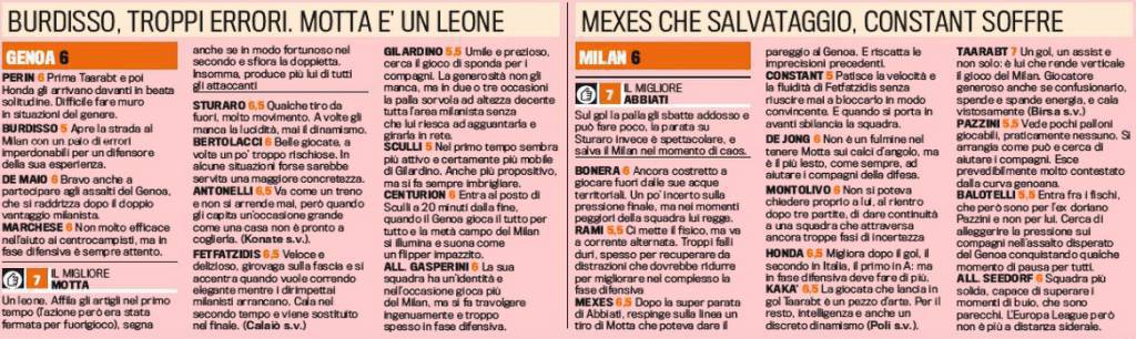 FOTO GENOA MILAN VOTI PAGELLE GAZZETTA ABBIATI MOTTA – Il Milan vince due a uno a Genova contro i liguri. La banda di Seedorf è alla terza vittoria consecutiva, ora è a meno cinque dai cugini nerazzurri. Il Milan ha cambiato marcia, la squadra di Seedorf è più equilibrata e autoritaria. Bella prestazione di Abbiati, il portiere rossonero ha salvato il risultato in più di qualche circostanza. Bene anche Taarabt autore del primo gol, così come Honda al suo primo gol in Serie A. Nel Genoa grande partita di Motta che non si arrende mai, delude Gilardino. Voti e pagelle della Gazzetta dello Sport.