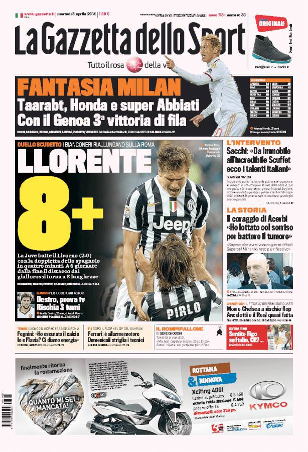 GAZZETTA LLORENTE – Una doppietta di Llorente permette alla Juventus di battere il Livorno e volare nuovamente a più otto dalla Roma.