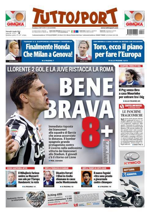 TUTTOSPORT JUVENTUS – Anche Tuttosport elogia la vittoria della Juventus contro il Livorno, Roma distante otto punti.