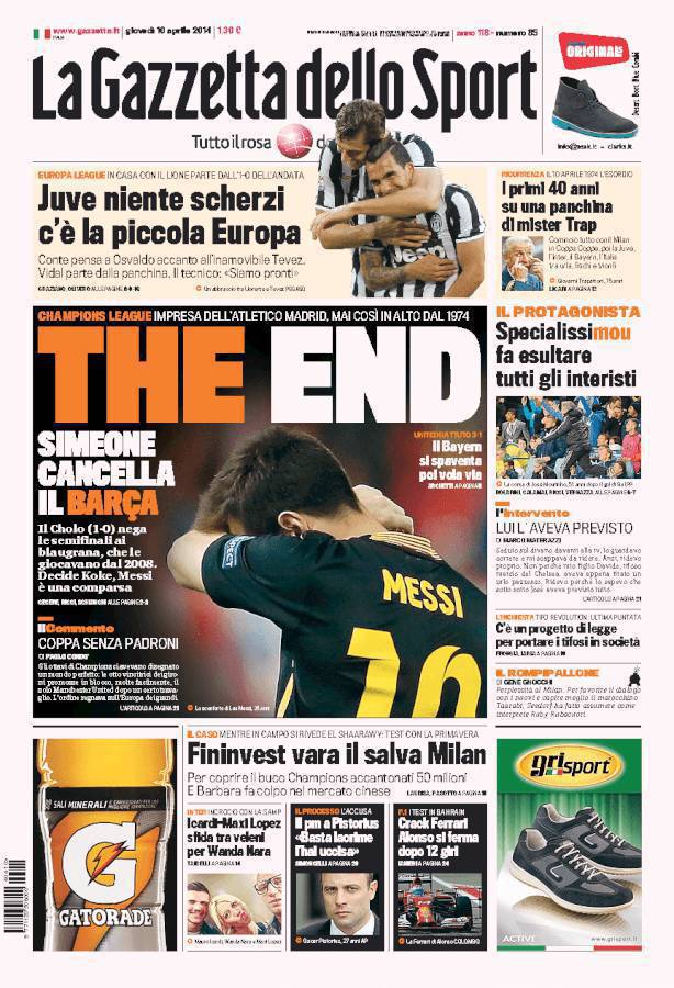 GAZZETTA BARCELLONA – La Gazzetta dello Sport parla del Barcellona che viene eliminato dalla Champions League da Simeone.