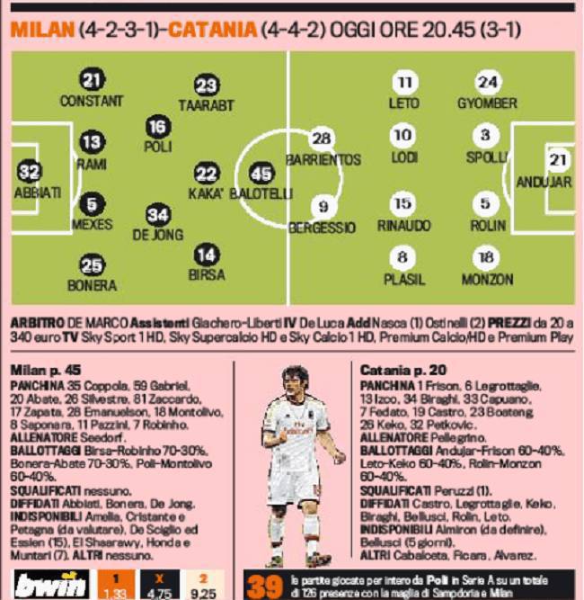 MILAN CATANIA PROBABILI FORMAZIONI – Il Milan va a caccia dell’Europa contro il Catania del nuovo allenatore Pellegrino, ormai con un piede in serie A. Clarence Seedorf, per cercare la quarta vittoria consecutiva, schiererà i suoi con il 4-2-3-1 con Abbiati tra i pali; Bonera, Mexes, Rami e Constant in difesa. De Jong e Poli in mezzo al campo. Birsa, Kakà e Taarabt sulla trequarti con Balotelli che torna al centro dell’attacco. Il Catania risponde con il 4-4-2 con Andujar in porta; Gyomber, Spolli, Rolin e Monzon in difesa. Leto, Lodi, Rinaudo, Plasil a centrocampo. Barrientos e Bergessio in attacco.
