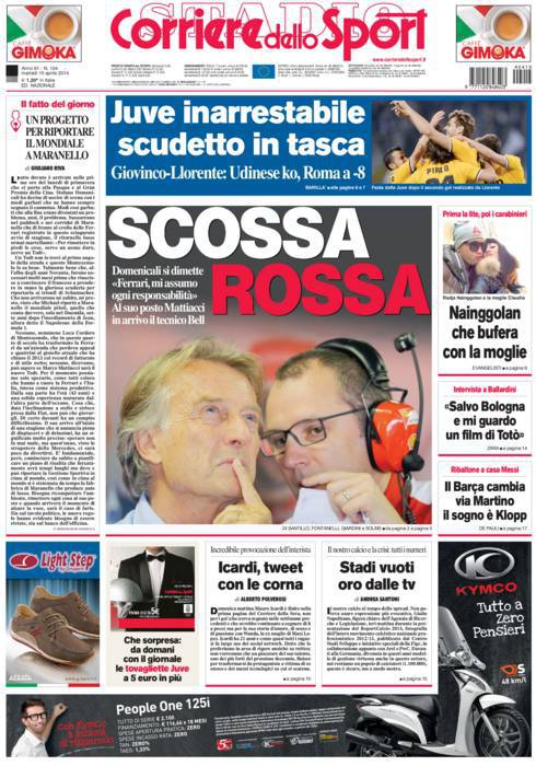 CORRIERE FERRARI – Il Corriere dello Sport parla del ribaltone in casa Ferrari con Domenicali che ha rassegnato le dimissioni. Al suo posto Mattiacci.