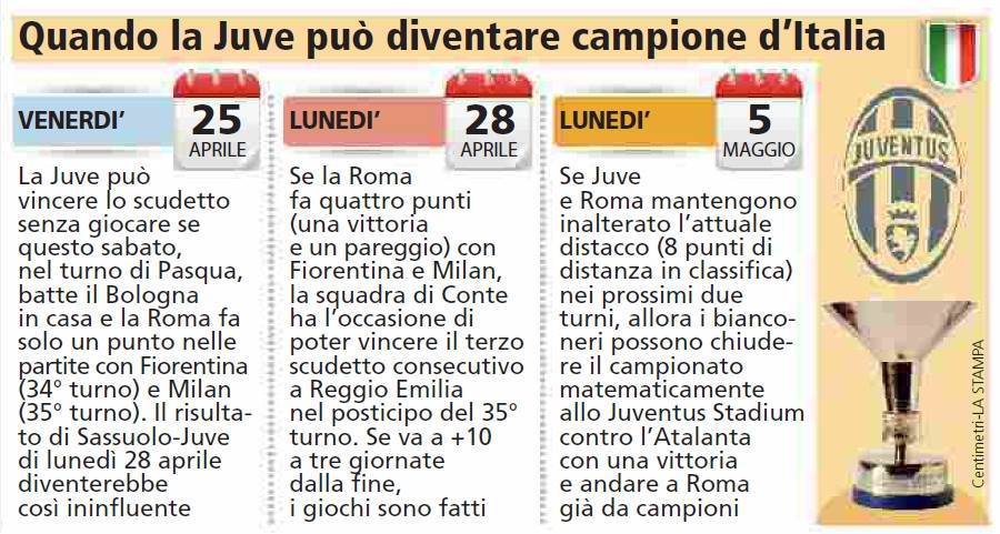 FOTO JUVENTUS SCUDETTO DATE CALENDARIO – E’ ormai conto alla rovescia per la vittoria del prossimo scudetto della Juventus. La società bianconera, come tutta la squadra, è ormai certa di poter raggiungere il terzo titolo italiano consecutivo, e per questa ragione sta già iniziando a pianificare la festa per quello che sarà il tricolore. All’interno del quotidiano “La Stampa”, stamani, un interessante schema che vi riportiamo: ecco il calendario completo delle prossime tappe di avvicinamento allo scudetto per la Juventus. 25 aprile, 28 aprile, 5 maggio o ancora più avanti: quando sarà lo “Juventus-day”?