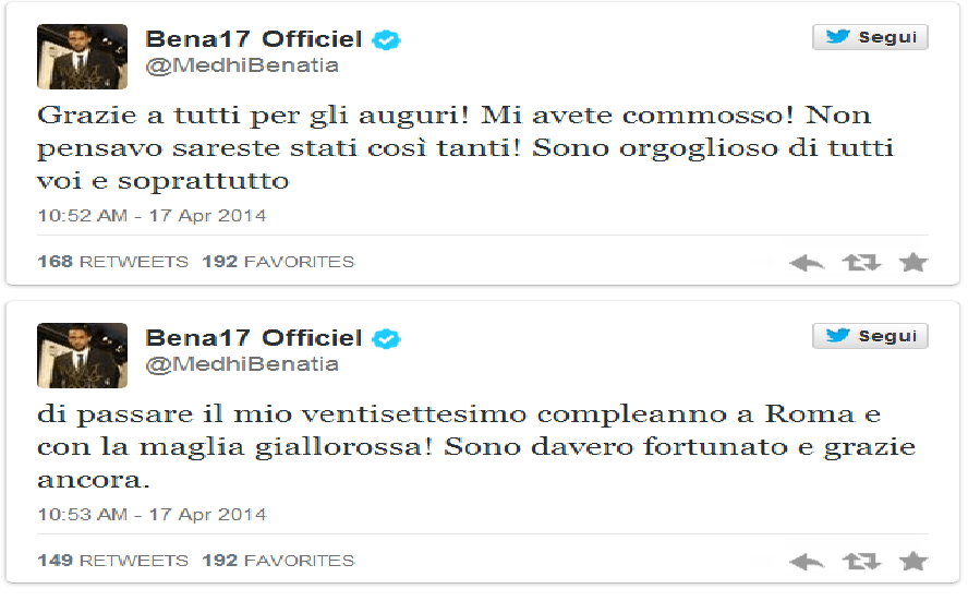 CALCIOMERCATO ROMA BENATIA- Parole distensive quelle di Mehdi Benatia su Twitter. Il difensore della Roma ringrazia sul social network tutti i tifosi che gli hanno fatto gli auguri per il compleanno (oggi raggiunge le 27 primavere). Non solo, nel suo “cinguettio” si dice orgoglioso di trovarsi a Roma, ma soprattutto orgoglioso di indossare la maglia giallorossa. Parole che fanno ben sperare i tifosi romanisti per il rinnovo: Benatia è infatti al centro dell’interesse di molte squadre europee ma la volontà a Trigoria è quella di tenerlo stretto. Ecco le sue parole: ‘Grazie a tutti per gli auguri! Mi avete commosso! Non pensavo sareste stati così tanti! Sono orgoglioso di tutti voi e soprattutto di passare il mio ventisettesimo compleanno a Roma e con la maglia giallorossa! Sono davvero fortunato e grazie ancora‘.