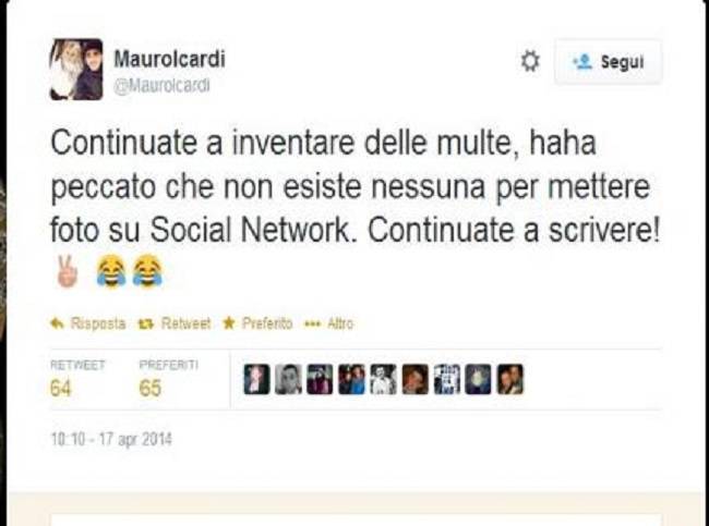 MAURO ICARDI E MAXI LOPEZ – La telenovela che vede coinvolti Mauro Icardi, Wanda Nara e Maxi Lopez non è ancora finita. L’annuncio di Wanda Nara sul suo addio a Twitter, sembrava la fine di una soap opera senza fine ma al suo posto, Mauro Icardi continua a tenere costantemente aggiornati tutti sulla loro vita privata. Notizia di ieri era l’ingiunzione ottenuta da Maxi Lopez nei confronti dell’ex moglie che obbligava l’attuale compagna di Icardi a non postare più le foto dei figli minorenni sui social network, pena una multa di 50mila euro per ogni violazione. Oggi, però, Icardi torna sull’argomento e lo fa nel solito modo irriverente postando il seguente messaggio su Twitter. Icardi ha ribadito che non esiste alcuna multa da pagare: “Le uniche multe che pago – ha cinguettato Icardi – sono quelle del traffico”.