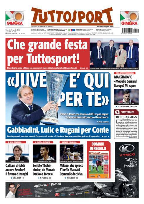 Tuttosport – Platini ‘Juve è qui per te’ 17/04/2014 di Ruggieri TUTTOSPORT PLATINI JUVENTUS – Su Tuttosport si parla dell’invito di Platini a vincere l’Europa League in questa stagione. La redazione di Calciomercatonews.com