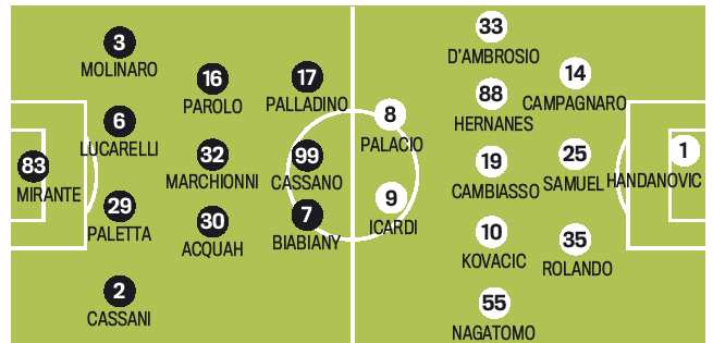 FOTO PARMA INTER CASSANO MAZZARRI CAMPAGNARO – Parma-Inter è un vero e proprio spareggio per quanto riguarda l’Europa League. L’Inter cercherà di vincere al Tardini, Mazzarri conferma la formazione che ha battuto la Sampdoria con l’unica eccezione di Ranocchia, squalificato, che verrà sostituito da Campagnaro. Confermato il centrocampo con Hernanes e Kovacic accanto a Cambiasso. In attacco la coppia Icardi-Palacio. Nel Parma invece c’è Cassano, l’ex di turno, che vuole dare un dispiacere al suo nemico Mazzarri. Completano l’attacco Palladino e Biabiany. Le probabili formazioni secondo la Gazzetta dello Sport.
