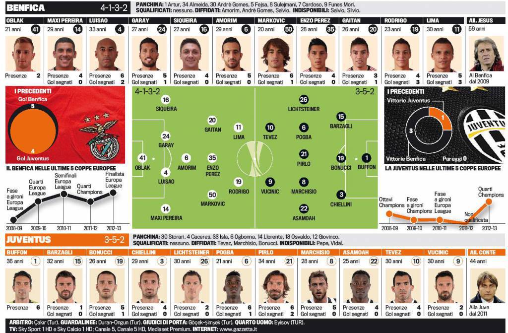 FOTO BENFICA JUVENTUS VUCINIC TEVEZ GAITAN – La Juventus questa sera giocherà in Portogallo in casa del Benfica per l’andata delle semifinali di Europa League. I bianconeri cercheranno di chiudere in Portogallo la pratica per poi approdare nella finale dello Juventus Stadium. Il Benfica però è un osso duro. Conte sceglie Vucinic che giocherà accanto a Tevez, mentre a centrocampo spazio a Marchisio vista l’assenza di Pogba. Nel Benfica occhi puntati sui gioielli Gaitan, esterno sinistro argentino e Rodrigo, centravanti brasiliano naturalizzato spagnolo. Ecco le probabili formazioni secondo la Gazzetta dello Sport.