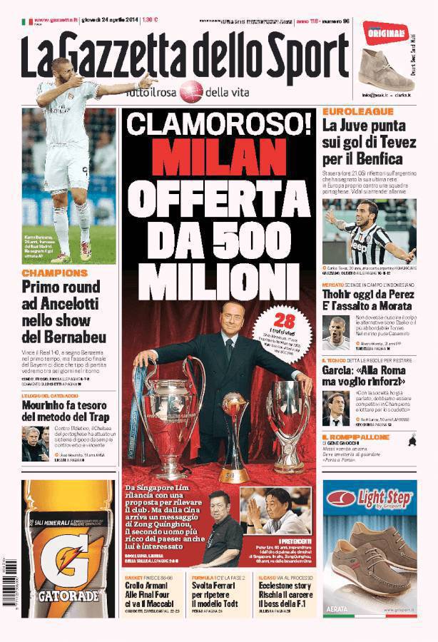 GAZZETTA CLAMOROSO MILAN – Dall’Asia arrivano due offerte importanti per l’acquisto del Milan, 500 milioni di euro la cifra offerta.
