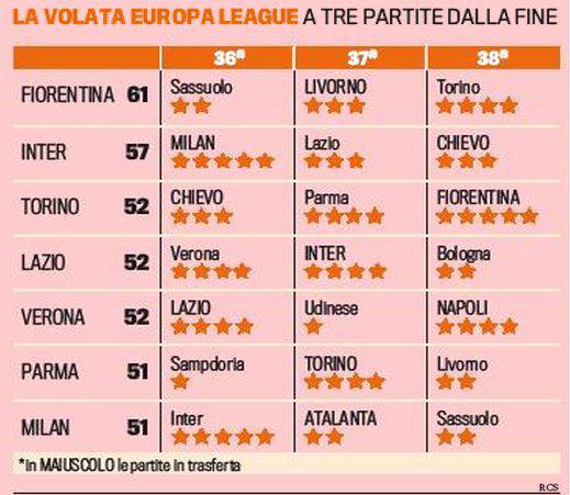 FOTO SERIE A CORSA EUROPA LEAGUE NEL VIVO CALENDARIO – Saranno 3 giornate ad altissima tensione quelle che ci attendono prima della conclusione del campionato di Serie A. Tanti posti in ballo, tanti obiettivi per le squadre e, soprattutto, tanti milioni di euro che le qualificazioni europee potrebbero portare. Avvincente è soprattutto la sfida per arrivare in Europa League: sono ben 7 le squadre invischiate per questa spettacolare lotta all’ultimo punto. Chi la spunterà? La Gazzetta dello Sport ci propone il calendario delle squadre in ballo: il Milan spera, Toro, Verona e Parma, sognano ad occhi aperti,