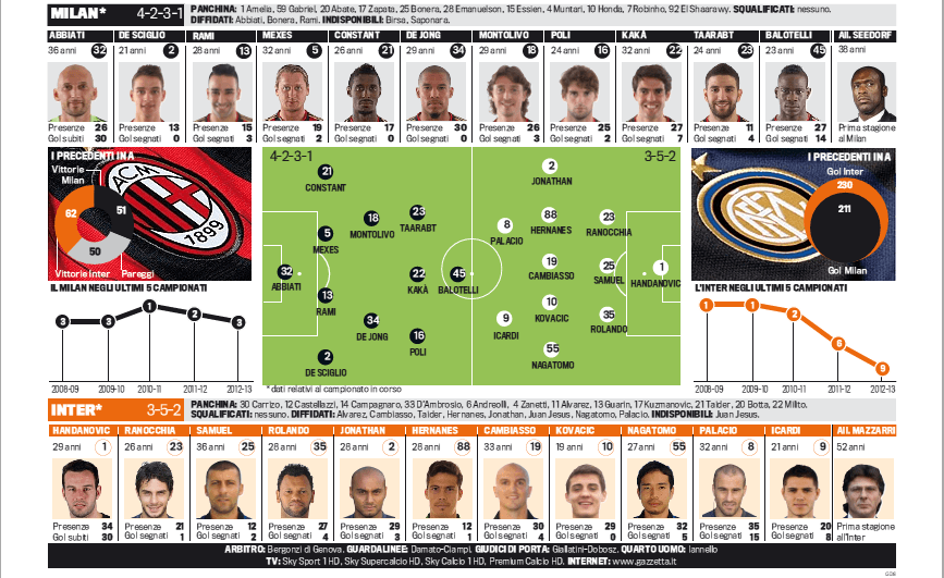 MILAN INTER PROBABILI FORMAZIONI – Tutto in una notte. E’ questo il destino di Clarence Seedorf che, questa sera, allo stadio Meazza di Milano, nel derby contro l’Inter di Walter Mazzarri, si gioca sia l’Europa sia la permanenza sulla panchina rossonera. Per il Milan non ci sono molte scelte: il Diavolo, infatti, deve giocare all’attacco e portare a casa i tre punti se vuole tentare di conquistare un posto in Europa. I nerazzurri, invece, potranno gestire. Clarence Seedorf schiererà il Milan con il 4-2-3-1 con Abbiati tra i pali; De Sciglio, Rami, Mexes e Constant in difesa. De Jong e Montolivo in mezzo al campo. Poli, Kakà e Taarabt sulla trequarti a sostegno dell’unica punta che sarà Balotelli. Walter Mazzarri risponde con il 3-5-2 con Handanovic tra i pali; Ranocchia, Samuel e Rolando in difesa. Jonathan, Hernanes, Cambiasso, Kovacic e Nagatomo a centrocampo mentre la coppia d’attacco sarà formata da Palacio e Icardi.