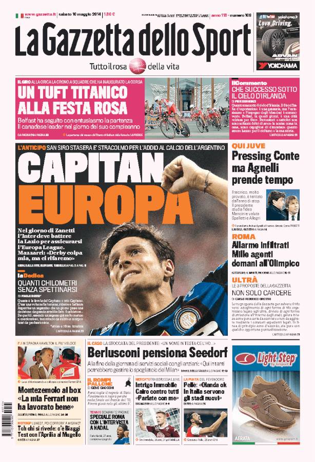 GAZZETTA ZANETTI – La Gazzetta dello Sport parla di Zanetti che oggi giocherà l’ultima volta a San Siro. Stadio strapieno per il Capitano.