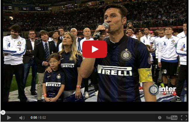 VIDEO INTER ZANETTI INTER LAZIO – E’ stato senza dubbio un momento molto emozionante per tutto il popolo interista quello avvenuto al termine della gara tra Inter e Lazio. Un commovente discorso quello tenuto dal capitano Javier Zanetti, per celebrare l’ultima gara con la maglia nerazzurra della sua splendida carriera. Parole dolci per tutti: per il presidente Moratti, per Thohir, per i tifosi, per i compagni presenti e passati. Giusto per non dimenticare quanto di buono è stato fatto in questi 20 anni di Inter. Ecco le meravigliose parole del ‘Tractor’ Zanetti: