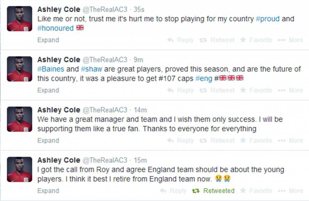 FOTO TWITTER ASHLEY COLE- Annuncio difficile quello che Ashley Cole ha affidato a Twitter. Il difensore inglese dichiara infatti: ‘Ho ricevuto una chiamata da Roy e sono d’accordo con lui: l’Inghilterra deve essere formata dai giovani. Credo sia meglio mi ritiri dalla nazionale adesso‘. Gesto di grande maturità quella di Cole, che non fa polemiche, ma anzi accetta la decisione del tecnico Hodgson. Ottime le parole del giocatore per i giovani Leighton Baines e Luke Shaw, colpiti dalla critica: ‘Sono grandi giocatori e lo hanno provato. Sono loro il futuro di questa nazionale‘. Conclude: ‘Fa male smettere di giocare per la nazionale‘, ma si dice fiero ed nonrato di averlo fatto.