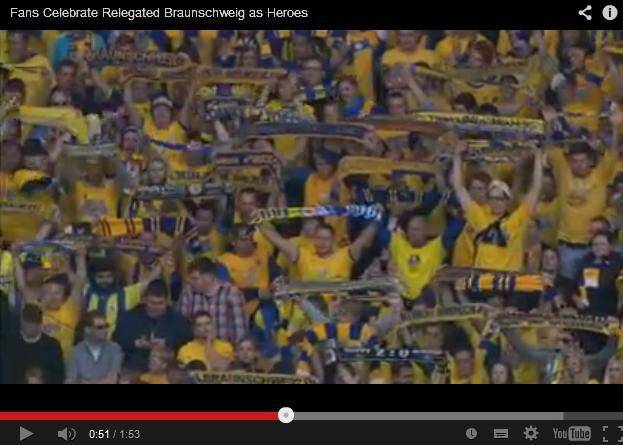 VIDEO BRAUNSCHWEIG- Incredibile quanto successo in Bundesliga: perdendo contro l’Hoffenheim, il Braunschweig è retrocesso, perdendo anche la possibilità di giocarsi lo spareggio. I tifosi però l’hanno presa bene: sciarpata e applausi alla squadra che ha sempre dato il massimo. Inoltre una bambina ha invaso il campo per regalare delle rose all’allenatore. Di seguito il video
