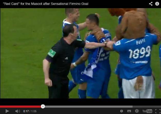 MASCOTTE HOFFENHEIM VIDEO- Dopo il gol fantastico girato da Roberto Firmino dell’Hoffenheim, la mascotte ufficiale del club ha esultato andando ad abbracciare l’attaccante brasiliano. L’arbitro ha però incredibilmente deciso di espellere la povera mascotte. Di seguito il video del gol e dell’incredibile rosso.