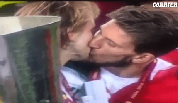 VIDEO BACIO GAY EUROPA LEAGUE – Un bacio gay durante la finale di Europa League non solo per festeggiare la vittoria ma anche per lanciare un messaggio importante al mondo sui diritti dei gay. Il capitano del Siviglia Rakitic e il compagno Carriço si sono baciati dopo la vittoria sul Benfica tra l’imbarazzo dei telecronisti, colti di sorpresa dal gesto die due. L’immagine del bacio è reale e ha suscitato il consenso della comunità gay che ha sottolineato l’importanza del gesto anche se i due non fossero gay. Dalle immagini, sembra che il bacio tra il capitano del Siviglia e il suo compagno di squadra sia stato reale ma, secondo quanto scrive il sito Giornalettismo, la verità sarebbe un’altra. La moviola delle immagini in questione ha rivelato che si tratta di un semplice bacio sulla guancia che, per la concitazione del momento, non è stato ben posizionato. I due calciatori, nel frattempo, non rilasciano dichiarazioni al riguardo lasciando tutti i tifosi con il dubbio…