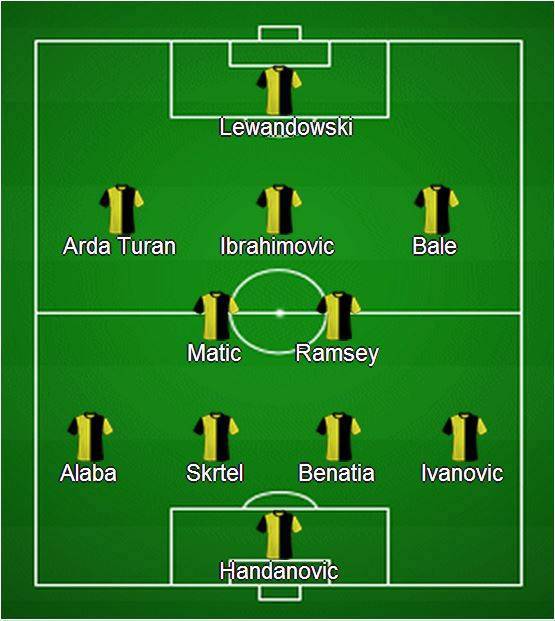 FOTO TOP 11 NON QUALIFICATI MONDIALI- Uno squadrone. Nomi eccellenti che mancheranno all’ormai prossima rassegna mondiale del calcio in Brasile. Impressionante soprattutto il potenziale offensivo, con Lewandowski supportato da un terzetto da brividi (anche nel prezzo dei cartellini): Arda Turan, Bale (uno dei due sarà campione d’Europa aggiudicandosi la Champions League tra una settimana) e Ibrahimovic. Per trovare giocatori della Serie A bisogna guardare al reparto arretrato: in difesa compare il marocchino Benatia della Roma e tra i pali il portiere dell’Inter Handanovic. A completare la difesa ci sono Alaba, Skrtel e Ivanovic. Davanti i due mediani Matic e Ramsey.