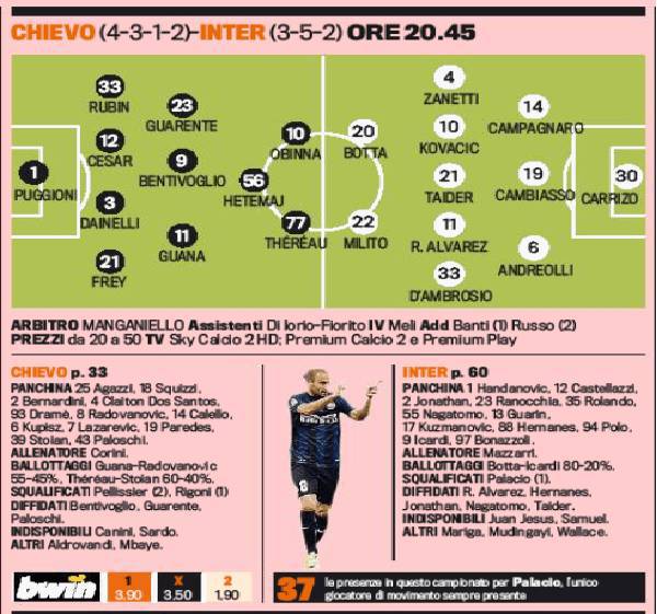 CHIEVO INTER PROBABILI FORMAZIONI – Ultima partita in nerazzurro per Cambiasso, Milito e Zanetti che nell’ultima partita della stagione, in trasferta contro il Chievo, partiranno titolari. Corini si affida al 4-3-1-2 con Puggioni in porta; Frey, Dainelli, Cesar e Rubin in difesa. Guana, Bentivoglio e Guarente a centrocampo. Hetemaj a sostegno delle due punte che saranno Thereau e Obinna, Mazzarri risponde con il 3-5-2 con Carrizo tra i pali, Andreolli, Cambiasso e Campagnaro in difesa. D’Ambrosio, Alvarez, Taider, Kovacic e Zanetti a centrocampo. Milito e Botta in attacco.