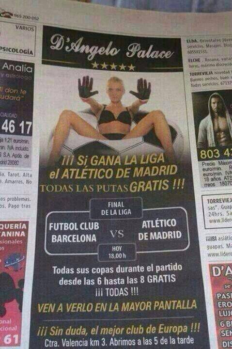 FOTO BORDELLO ALTLETICO LIGA – Ha davvero dell’incredibile la promozione realizzata e pubblicizzata da una casa di appuntamenti in Spagna: in occasione della gara giocata ieri tra Barcellona ed Atletico Madrid, se la squadra allenata da Simeone fosse riuscita ad uscire illesa dallo scontro del Camp Nou e, conseguentemente, a vincere la Liga, a tutti i clienti sarebbe stato concesso di poter trascorrere del tempo con le donne del locale, senza dover pagare assolutamente nulla. Un’idea geniale quella del proprietario del “D’Angelo Palace”, capace di attirare certamente tanta gente e, soprattutto, di ottenere una grande notorietà in tutto il mondo. Siamo certi che, i clienti accorsi a vedere la gara nella nota casa d’appuntamenti iberica, anche i tifosi di Barça e Real Madrid, abbiano festeggiato il trionfo dell’Atletico Madrid…