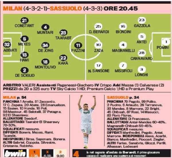 MILAN SASSUOLO PROBABILI FORMAZIONI – Il Milan cerca di conquistare l’ultimo biglietto disponibile per l’Europa League contro il Sassuolo, già salvo. Clarence Seedorf si affida al 4-3-1-2 con Abbiati in porta; De Sciglio, Rami, Mexes e Constant in difesa. Montolivo, De Jong e Muntari a centrocampo. Kakà e Taarabt sulla trequarti a sostegno dell’unica punta che sarà Pazzini, Di Francesco risponde con il 4-3-3 con Pomini tra i pali; Longhi, Cannavaro, Antei e Gazzola in difesa. Missiroli, Magnanelli e Biondini a centrocampo. Sansone, Zaza e Berardi in attacco.