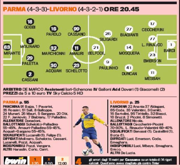 PARMA LIVORNO PROBABILI FORMAZIONI – L’ultima squadra a giocarsi l’Europa League è il Parma di Roberto Donadoni che ospita in casa il Livorno, già retrocesso in serie B. Donadoni si affida al 4-3-3 per centrare l’obiettivo con Mirante in porta; Cassani, Paletta, Molinaro e Gobbi in difesa. Acquah, Marchionni e Parolo a centrocampo. Schelotto, Amauri e Cassano in attacco. Nicola risponde con il 4-3-2-1 con Bardi tra i pali; Mesbah, Emerson, Rinaudo e Ceccherini in difesa. Duncan, Mosquera e Biagianti a centrocampo. Paulinho e Siligardi sulla trequarti a sostegno dell’unica punta che sarà Belfodil.