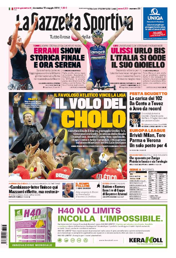 RASSEGNA STAMPA GAZZETTA DELLO SPORT – Sanchez illude il Barcellona, Godin pareggia e regala la Liga all’Atletico Madrid. Simeone in trionfo in attesa della finale di Champions contro il Real Madrid in programma sabato 24 maggio. La carica dei 102: da Conte a Tevez, è Juve da record. Brividi Milan, Toro, Parma e Verona: un solo posto in Europa League per 4.