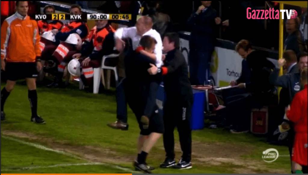 VIDEO ESULTANZA CORSA ALLENATORE- Goia pura quella che sprigiona Frederik Vanderbiest, tecnico dell’Oostende. La sua squadra si trova in svantaggio per 1-2 al 90esimo ma, proprio nel primo minuto di recupero, l’Oostende in contropiede agguanta il pareggio, scatenando la reazione del tecnico belga. Una corsa che ricorda illustri colleghi: molto simili le esultanze di allenatori come Mourinho, Conte o Jurgen Klopp. Seppur scatenata e davvero divertente, c’è da dire però che l’indimenticabile, folle corsa di Carlo Mazzone dopo il pareggio del suo Brescia contro l’Atalanta è ancora irraggiungibile.
