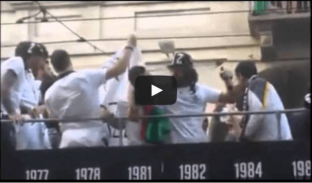 Domenica pomeriggio, dopo l’ultima vittoria della Juventus contro il Cagliari che ha permesso alla squadra di antonio Conte di raggiungere il record assoluto dei 102 punti in classifica, Andrea Pirlo, leggenda del calcio italiano, si è scatenato come non mai e nel video che vi proponiamo oggi appare come nessuno l’ha mai visto. Andrea Pirlo, infatti, nella parata della Juventus appare totalmente ubriaco. Andrea Pirlo, in compagnia di tutti i compagni di squadra, sul pullman scoperto della Juventus, nella parata fatta in giro per la città di Torino, si lascia andare e comincia a bere in compagnia degli amici per festeggiare uno scudetto che è davvero storico. Pirlo, dopo aver bevuto tanto, si accascia sul sedile anteriore per evitare conseguenze negative. Un comportamento, però, che è totalmente giustificabile. Dopo la vittoria del terzo scudetto consecutivo, come dare torto ad Andrea Pirlo che si è finalmente scatenato? Questo Andrea Pirlo, tuttavia, piace molto ai tifosi della Juventus che finalmente hanno potuto ammirare Andrea Pirlo sotto altre vesti. Chissà se anche in queste condizioni Andrea Pirlo riuscirebbe a tirare le sue magnifiche punizioni. I tifosi dell’Italia ora si augurano che Andrea Pirlo possa scatenarsi allo stesso modo dopo una vittoria della Nazionale di Cesare Prandelli.