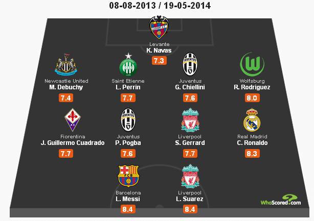 FOTO TOP 11 EUROPA – Il portale Whoscored.com ha stilato sulla base di analisi statistiche – quali presenze, gol, assist e altri dati indicati nel sito – l’undici migliore formato da giocatori provenienti dai maggiori tornei d’Europa. In questa top 11 (vedi foto) troviamo tre giocatori di Serie A e altrettanti di Premier League e Liga: spazio poi ad un elemento a testa di Bundesliga e Ligue 1. Nel 4-4-2 proposto, in porta è stato premiato Navas (Levante) mentre i difensori portano il nome di Debuchy (Newcastle), Perrin (St.Etienne), Chiellini (Juventus) e Rodriguez (Wolfsburg). A centrocampo troviamo Cuadrado (Fiorentina) e Cristiano Ronaldo (Real Madrid) sulle fasce mentre in mezzo ecco Pogba (Juventus) e Gerrard (Liverpool). In attacco un tandem offensivo pauroso: Messi (Barcellona) e Suarez (Liverpool).