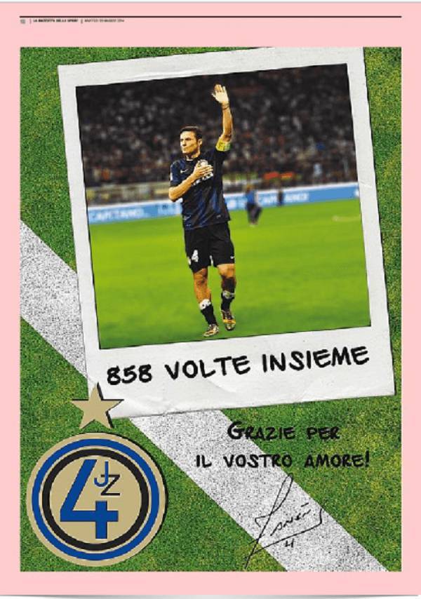 Dopo l’ultima apparizione con la maglia nerazzurra, per Javier Zanetti sta per cominciare un nuovo capitolo della sua vita che, i tifosi, si augurano possa essere pieno di vittorie come lo è stata la sua vita calcistica. Dopo le lacrime dei tifosi per la sua ultima partita e il saluto emozionante di tutto il popolo interista per il proprio capitano, Javier Zanetti ha deciso di ringraziare a modo suo tutti i tifosi dell’Inter che, in tutti questi anni, l’hanno sempre amato e sostenuto. Javier Zanetti ha così voluto salutare i propri tifosi a modo suo. Nessun messaggio sui social network ma un grande messaggio d’amore. Con una pagina intera della Gazzetta dello Sport, Javier Zanetti ha ringraziato tutto il popolo interista per tutti gli anni meravigliosi trascorsi insieme. Una foto di Javier Zanetti con la maglia dell’Inter, lo scudetto dell’Inter con il numero 4 e una frase semplice ma sincera: “858 volte insieme. Grazie per il vostro amore”.
