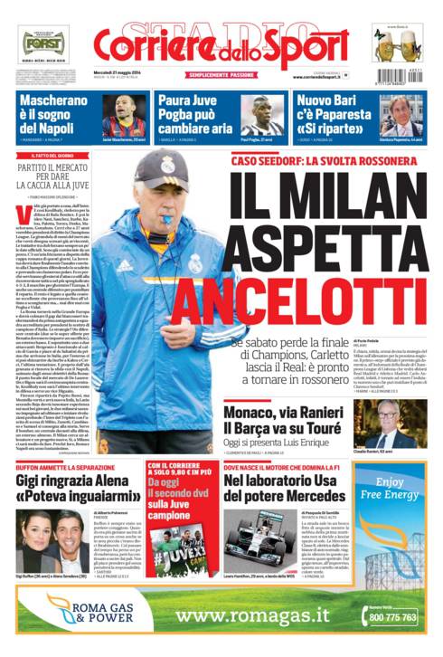 RASSEGNA STAMPA CORRIERE DELLO SPORT – Il Milan aspetta Carlo Ancelotti: se sabato il tecnico perde la finale di Champions, Carletto lascia il Real e sarebbe pronto a tornare rossonero. Mascherano è il sogno del Napoli. Paura Juve: Pogba può cambiare aria. L’ex arbitro Paparesta salva il Bari: “Si riparte”.