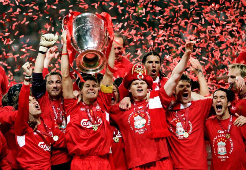 I giocatori del Liverpool festeggiano ad Istanbul la clamorosa rimonta nella finale di Champions League sul Milan del 2005