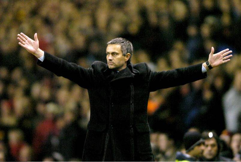 Jose Mourinho festeggia nella linea laterale dopo la vittoria del Porto contro il Manchester United nella Semi-Finale del 2004