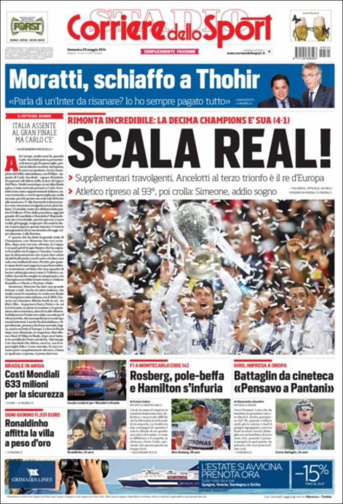RASSEGNA STAMPA CORRIERE DELLO SPORT – Rimonta incredibile del Real Madrid di Carlo Ancelotti. Pareggia al 93′ con Sergio Ramos e si scatena nei supplementari. Il Real conquista la Decima. Ancelotti, al terzo trionfo, è il re d’Europa. Moratti, schiaffo a Thohir: “Parla di un’Inter da risanare? Io ho sempre pagato tutto”.