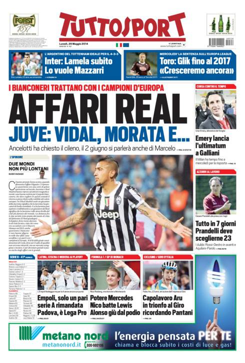 TUTTOSPORT REAL VIDAL – La Juventus proverà a trattare con il Real Madrid per qualche affare importante, da Vidal a Morata.