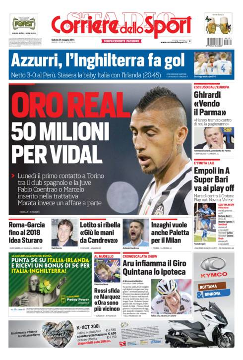 CORRIERE REAL MADRID VIDAL – Sul Corriere dello Sport si parla di Vidal, il Real Madrid è disposto a sborsare 50 milioni di euro per il giocatore cileno.