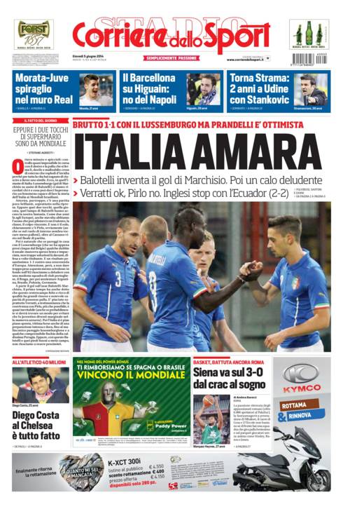 CORRIERE ITALIA – Sul Corriere dello Sport si parla dell’Italia che pareggia contro il Lussemburgo, bene Verratti male Pirlo.