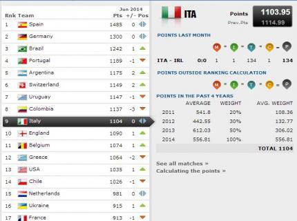 FOTO RANKING FIFA- E’ stato reso pubblico il ranking Fifa aggiornato a giugno. Non ci sono movimenti per le prime due posizioni, dove si confermano Spagna e Germania. Il Brasile sale al terzo posto, guadagnando il gradino basso del podio, scavalcando il Portogallo. In crescita l’Argentina, che sale di due posizioni sino al quinto posto, trascinando dietro di sé anche la Svizzera, sesta nella classifica. Stazionaria l’Italia nella top ten, più precisamente al non gradino del ranking. A poca distanza l’Inghilterra che affronteremo il 14 giugno ai Mondiali.