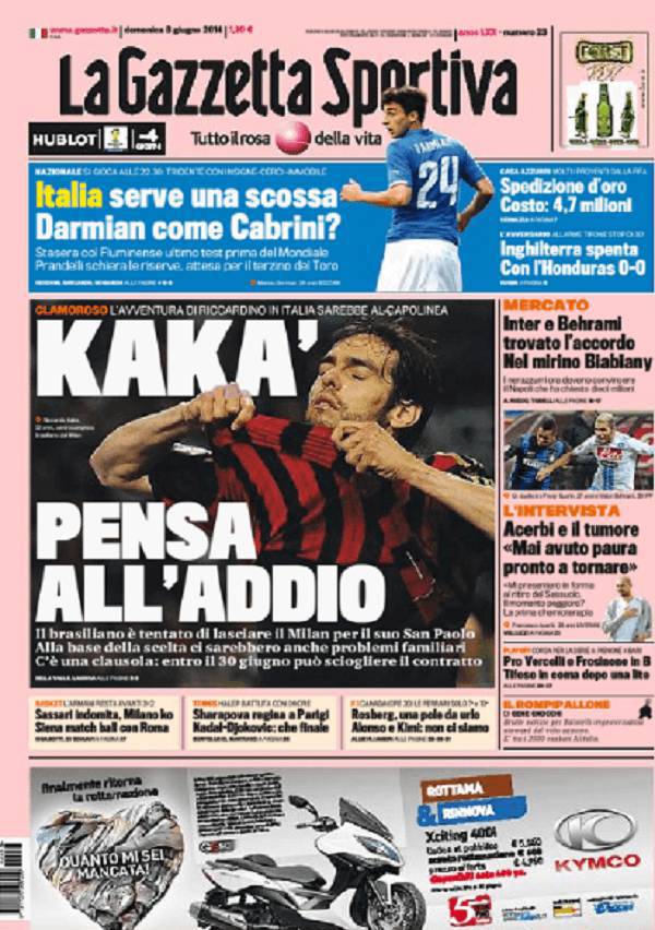 RASSEGNA STAMPA GAZZETTA DELLO SPORT – Kakà pensa all’addio. Nel mirino del brasiliano c’è un ritorno al San Paolo. Inter e Behrami, trovato l’accordo. Nel mirino Biabiany. Acerbi e il tumore: “Mai avuto paura. Pronto a tornare”. Italia, serve una scossa: Darmian come Cabrini?