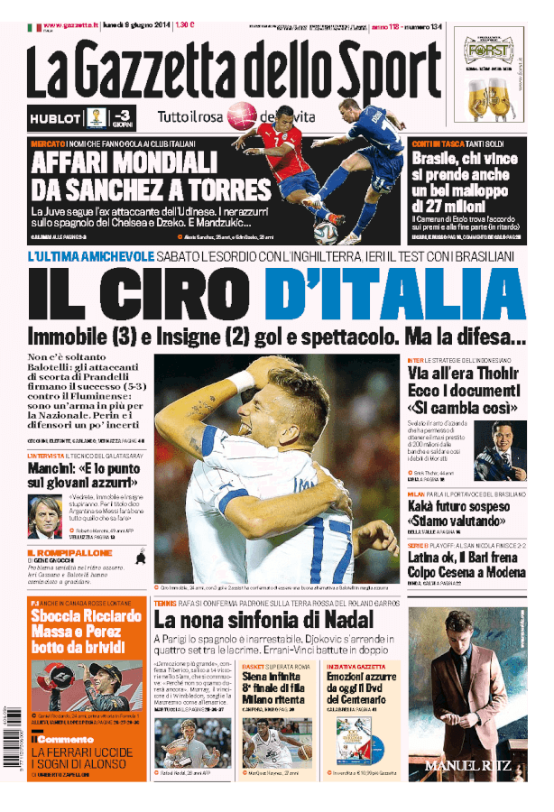GAZZETTA ITALIA – Sulla Gazzetta dello Sport si parla della vittoria dell’Italia per cinque a tre contro il Fluminense con tripletta di Immobile e due gol di Insigne sempre su assist del nuovo bomber del Borussia.